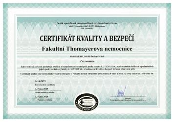 Fakultní Thomayerova nemocnice (FTN) úspěšně obhájila Certifikát kvality a bezpečí udělovaný Českou společností pro akreditaci ve zdravotnictví, s.r.o..Ocenění tak nemocnici potvrzuje na další tři roky, a to až do 3. 10. 2028. Tento certifikát získávají pouze ta zdravotnická zařízení, která splňují nejpřísnější standardy a kritéria pro poskytování kvalitní a bezpečné lůžkové péče.