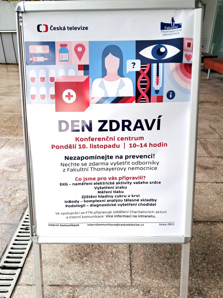 Fakultní Thomayerova nemocnice (FTN) uspořádala pro zaměstnance České televize Den zdraví a o akci byl mimořádný zájem. Během dne dorazilo více než 300 účastníků, kteří využili možnost nechat si prověřit svůj zdravotní stav a poradit se se zdravotníky z FTN. V nabídce byl pestrý program vyšetření a konzultací. Zájemci si mohli například změřit krevní tlak či hladinu cukru v krvi, nechat si analyzovat tělesnou skladbu pomocí moderního přístrojového vybavení nebo konzultovat životosprávu s odborníky na výživu a zdravé stravování.