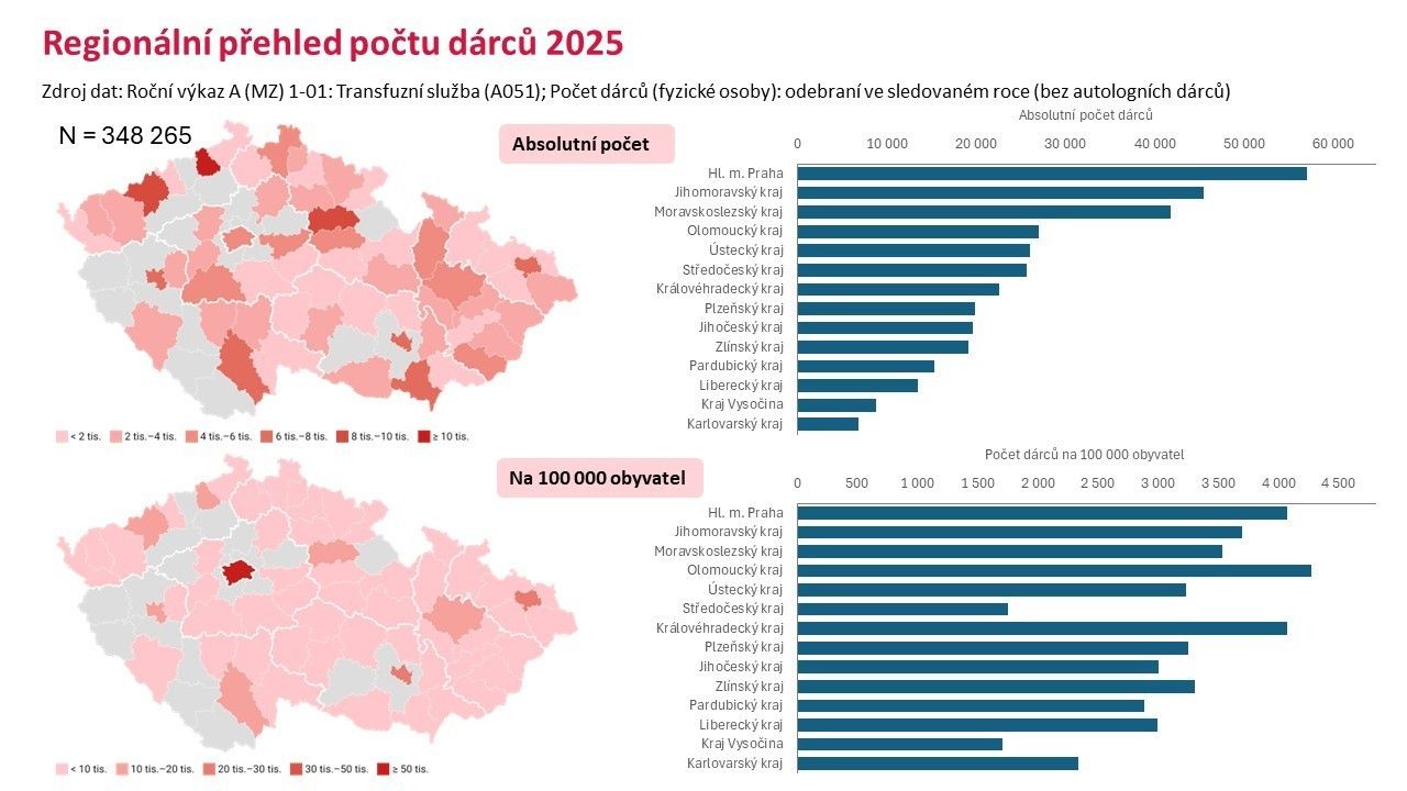 Podle aktuálních dat Ústavu zdravotnických informací a statistiky ČR (ÚZIS) bylo v roce 2025 v České republice evidováno více než 430 tisíc dárců krve, což představuje mírný pokles oproti roku 2024, kdy jich bylo téměř 447 tisíc. Odběr v loňském roce absolvovalo přes 348 tisíc dárců, zatímco o rok dříve to bylo více než 362 tisíc. Významnou roli přitom hrají i noví dárci – jejich počet však meziročně klesl z více než 86 tisíc v roce 2024 na přibližně 61 tisíc v roce 2025. Průměrný věk dárců činí 39 let a dlouhodobě převažují muži, kteří tvoří přibližně 59 % dárcovské základny. Regionálně patří k nejaktivnějším oblastem Praha, Moravskoslezský a Jihomoravský kraj. Data tak jasně ukazují, že i přes stále robustní dárcovskou základnu dochází k jejímu postupnému oslabování, a potvrzují nutnost systematicky oslovovat nové, zejména mladší prvodárce.