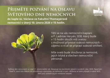 Fakultní Thomayerova nemocnice (FTN) Vás zve na oslavu Světového dne nemocných, která se bude konat 10. února v 15.00 hod. ve kapli sv. Václava. Hostem bude Ladislav Heryán, SDB, který je českým katolickým knězem, biblistou, pedagogem a autorem spirituální literatury.