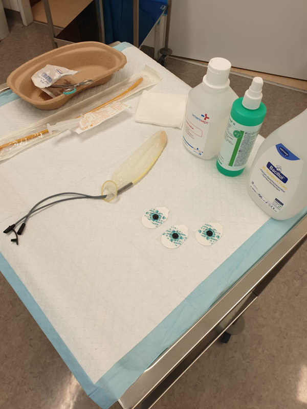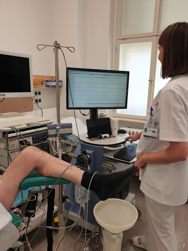 V kabince si svléknete boty, kalhoty a spodní prádlo. Poté vás sestra požádá, abyste se vymočil/a do speciálního přístroje. Následně se posadíte na gynekologické křeslo, kde vám lékař zavede tenké cévky do močového měchýře a konečníku. Pomocí cévek bude lékař pomalu naplňovat močový měchýř.